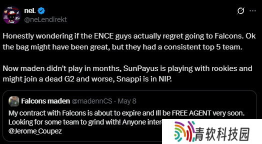 “老实说,我在想老ENCE的那一批人是否会后悔当初去了Falcons战队。好吧,钱肯定是没少给,但他们(ENCE)曾经是一支稳定TOP5的队伍。