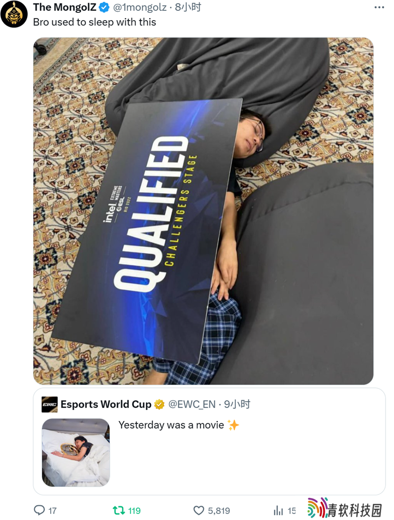 而在评论区中,The MongolZ也打趣的回复道:“以前他都是和这(晋级标志)睡的。”