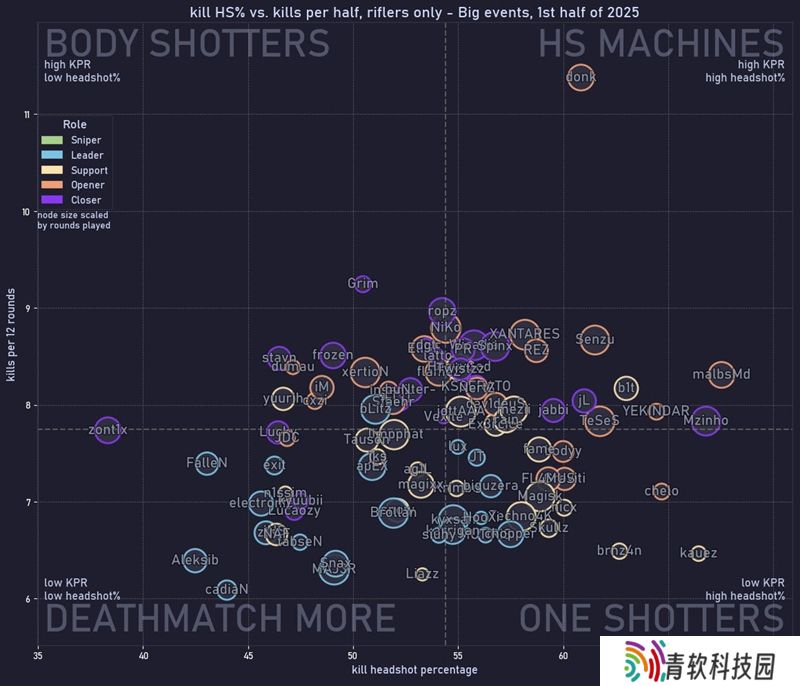 笔者认为,它比击杀爆头率更能反映瞄准能力,核心原因在于样本量:一线选手平均每图仅14.26次击杀,每次击杀的爆头与否是“非黑即白”的二元结果;而伤害数据不仅包含所有命中子弹(每图每选手45.27次,是击杀数的3倍),还能体现每颗子弹的权重。笔者虽爱数据,但始终认为数据应辅助观赛感受——对满血敌人的一发爆头,显然比MP9的头部轻击更有意义。此外,狙击手也需被排除,因他们的大量伤害来自身体命中。