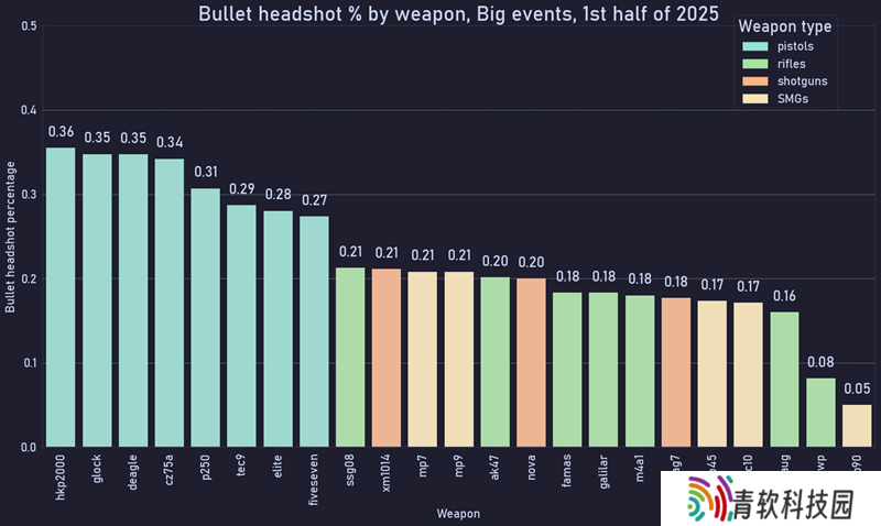 另一种计算方式是:将每颗子弹一视同仁——要么击中头部,要么击中身体其他部位。关键是要排除未命中的子弹,否则烟雾弹乱射等随机操作会引入大量干扰。笔者曾直觉认为,这个百分比会受枪械类型影响很大,但实际数据并非如此: