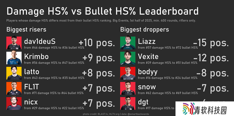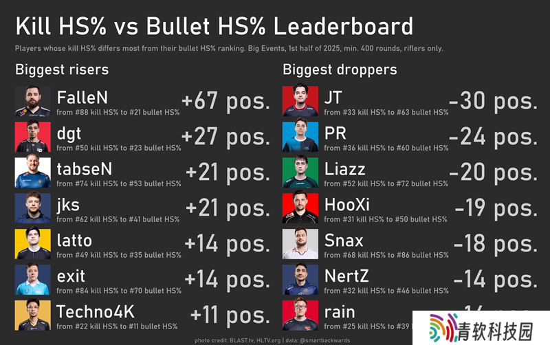 如图所示,击杀爆头率与子弹爆头率的排名差异并非无关痛痒。前文已提,FalleN因使用AWP在击杀爆头率中被低估;而tabseN和jks则从垫底跃升至中游。JT、HooXi,以及出人意料的PR,则从中游跌至下游。
