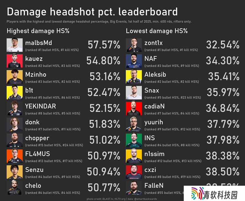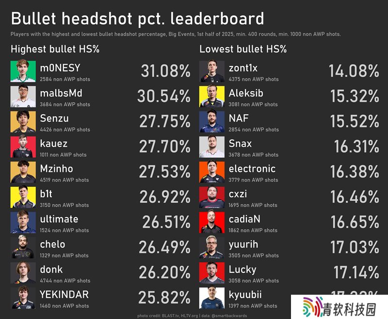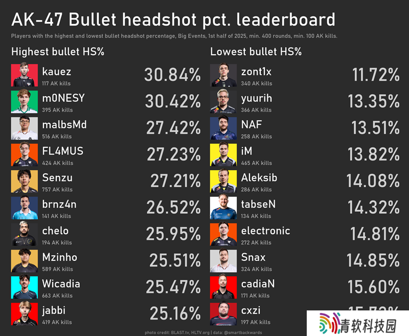 还有一个值得注意的名字:Senzu。他在HLTV击杀爆头率排行榜中位列第七(若计入kauez和chelo则为第九),且仅7.5%的击杀来自AWP。The MongolZ中,mzinho的爆头能力常被称赞,但或许我们该重新审视这个话题了。