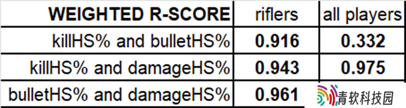 笔者计算了相关系数(R值):在步枪手中,伤害爆头率与子弹爆头率的相关性最高(0.96);击杀爆头率与子弹爆头率的相关性为0.92;伤害爆头率与击杀爆头率的相关性为0.94。可以说,伤害爆头率兼具二者优势——既包含子弹爆头率的“爆头频率”,又体现击杀爆头率的“爆头影响力”。