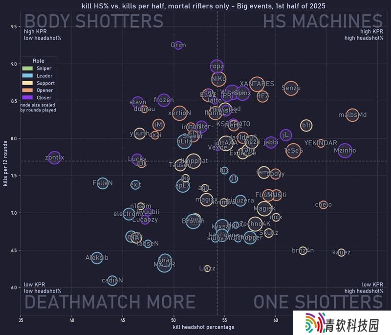 笔者绝非质疑Snax的传奇地位(毕竟笔者买过IEM 克拉科夫站的门票),但他在该指标中排名低于zont1x,或许意味着他作为顶级击杀者的时代已过——从G2指挥位退下,其实无妨。