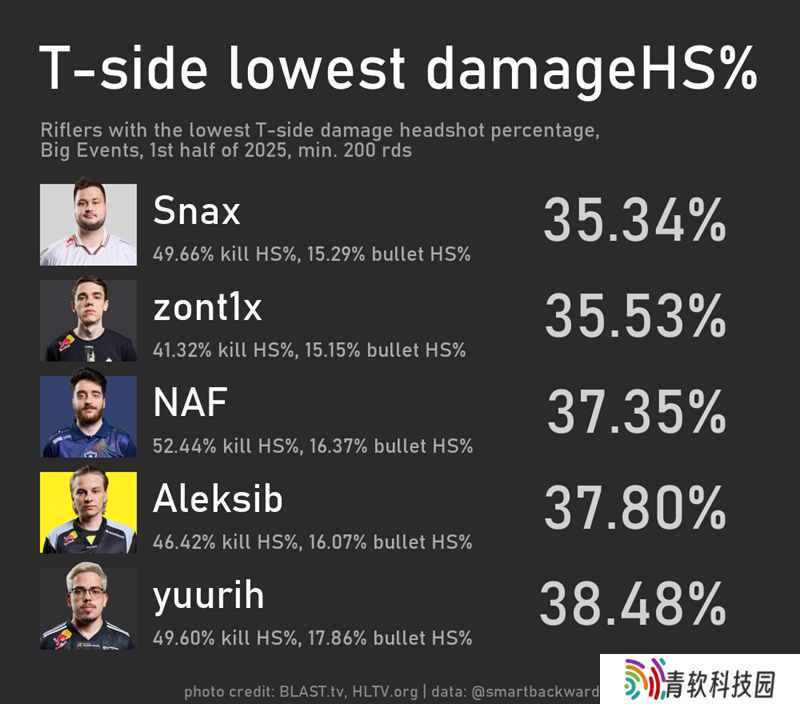 如前文所述,指标应服务于观赛结论。众所周知,zont1x刻意瞄准身体(cs2的voo在油管视频中对此有精彩分析)。但笔者研究发现,今年他在进攻方的伤害爆头率并非最低: