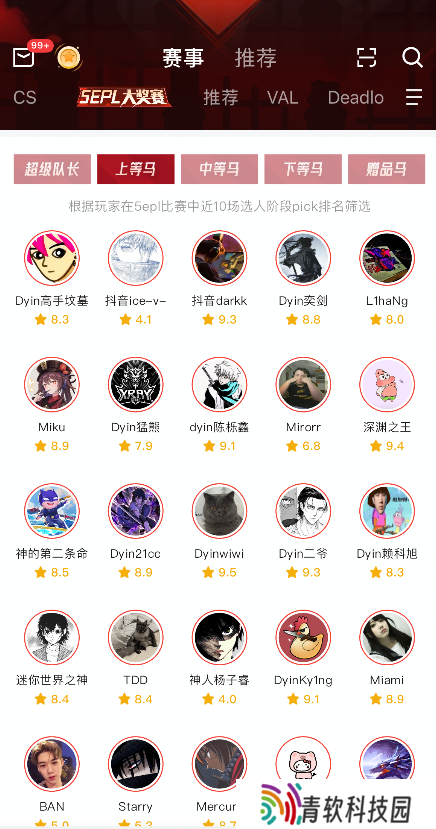 点开上等马页面,我们可以看到在茫茫多抖海主播的包围下,来自御三家的L1haNG、Starry、Mercury捍卫了职业选手的荣耀,路人王Miku也排在前列。而被我们5E用户评价为“又快又快”的K神kennyS也是本次5EPL超级大奖赛的上等马。
