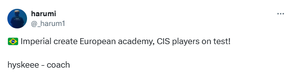 据独联体电竞圈知情人士harumi通过社交平台爆料,巴西豪门Imperial战队正在筹划组建欧洲青训队,目前已在独联体(CIS)地区开展新人试训。该计划自2023年启动筹备,历经延期后终于进入实质阶段。