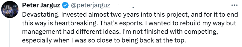 “太令人沮丧了。我在这个项目上投入了近两年时间,以这样的方式结束真的让人心碎。这就是电子竞技。我本想按自己的方式重建,但管理层有不同的想法。我还没结束自己的竞技生涯,尤其是我已经如此接近重回巅峰。”