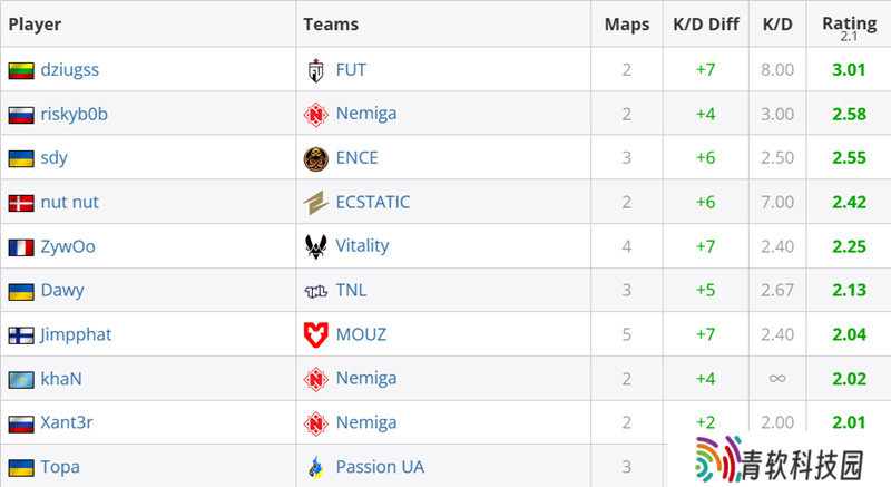 排名第一的是FUT(前NAVI青训战队)选手dziugss,他在两张地图的手枪局中打出了3.01 Rating;第二名riskyb0b为两张地图2.58 Rating;sdy排在第三,3图2.55 Rating。