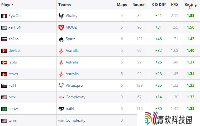 排名第一的是ZywOo,他在4张地图上有着1.55的Rating;第二名xertioN为5图1.50 Rating;第三名sh1ro为6张地图1.43 Rating。比较罕见的是Spirit战队的明星选手donk并没有出现在此次榜单的前十当中。