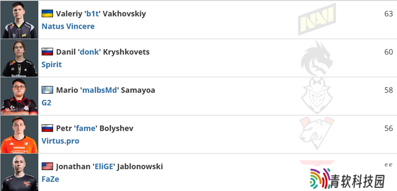“爆头大帝”b1t登顶,他在两场BO3的比赛中贡献了63次爆头击杀,donk排在第二。