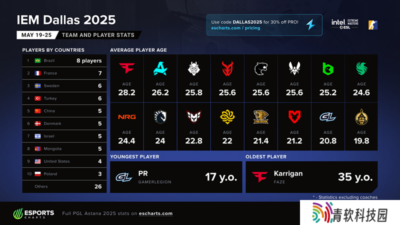 近日,国外数据统计门户网站Esportscharts分享了IEM 达拉斯站的一些选手、战队数据。其中包括平均年龄最大和最小的参赛队伍,参赛人数最多的国家,以及最年轻和最年长的参赛选手。