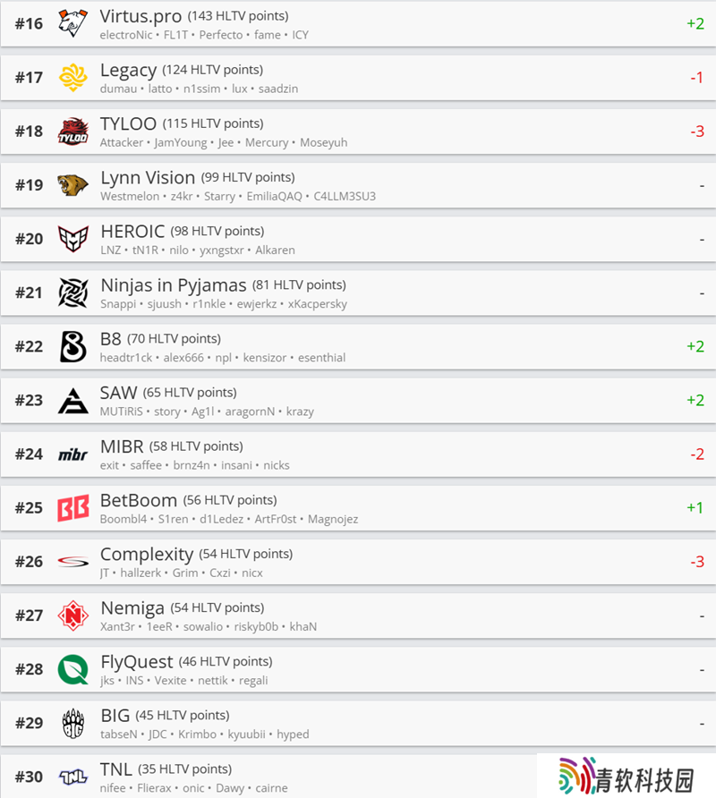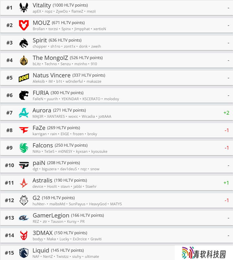 今天HLTV公布了最新一期世界排名,相比于之前的排名,本次排名中前十变动不大。原因在于BLAST 赏金赛S2的线上预选赛刚刚结束,强队基本上都已经成功晋级。
