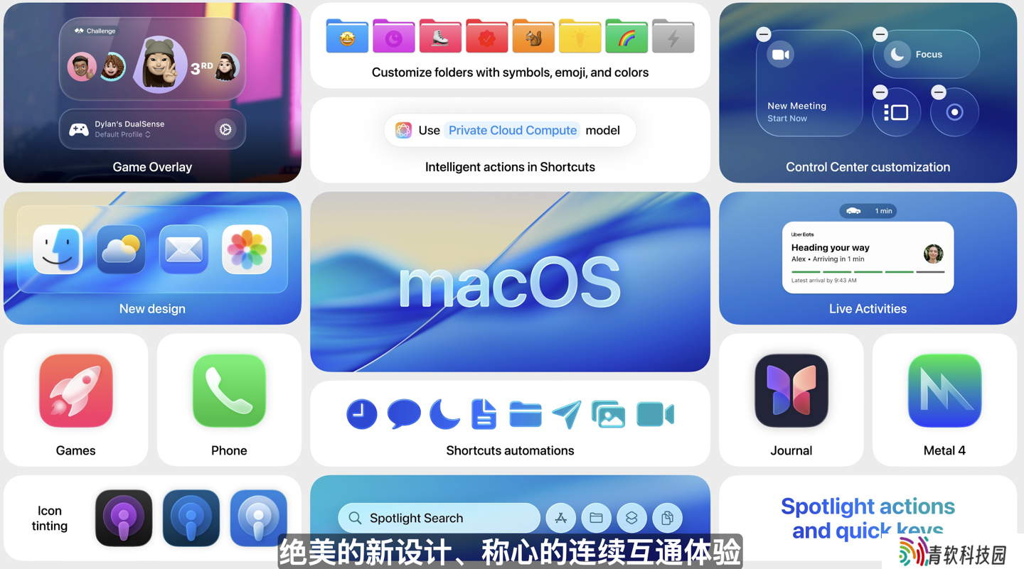 macOS 26 Tahoe 主要带来全新玻璃风格设计、升级的 Spotlight 聚焦功能、新增游戏 App 和 Metal 4 支持。系统还新增电话 App 和实时翻译功能等,本站小伙伴可点此查看完整更新内容。