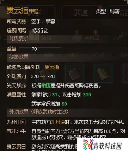 1、作为一个甲级的拳法,这个拳法是在琅琊阁的阁主那边获取的,学习了该功法之后,角色自己的外功属性可以得到增强,提升点数达到了120点。