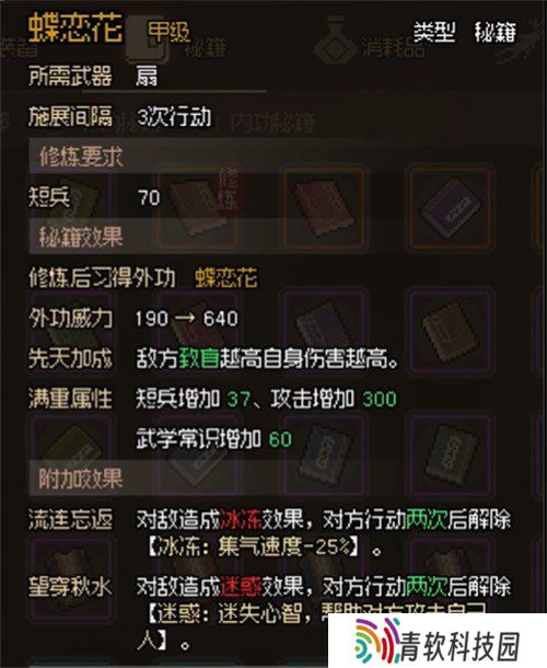 1、这本武学的名字比较诗情画意,而这门武学的关键武器就是扇子,是一个甲级的扇法,大家在学习了这个武学之后,自己的勤工还有攻击力都会得到提高,武学常识也会增强。
