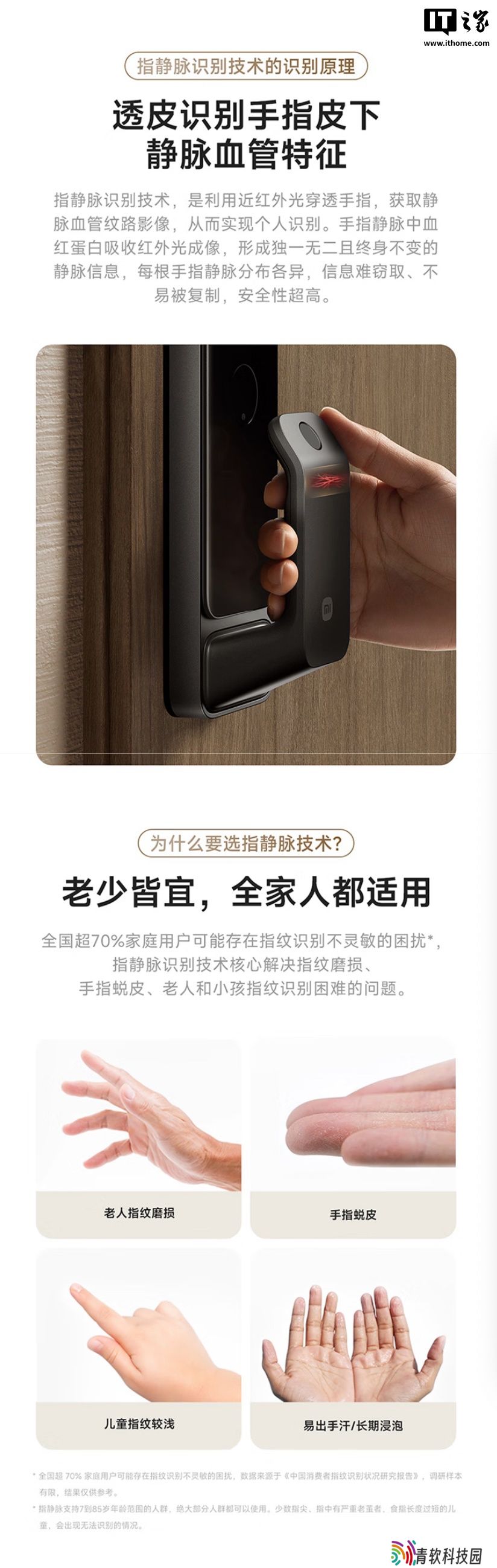 据介绍,该指纹锁指静脉识别技术,利用近红外光穿透手指,获取静脉血管纹路影像,从而实现个人识别。指静脉识别技术核心解决指纹磨损手指蜕皮,以及老人和小孩指纹识别困难的问题。内置 AI 算法,经大数据模型深度训练,号称“用得越久越好用”。