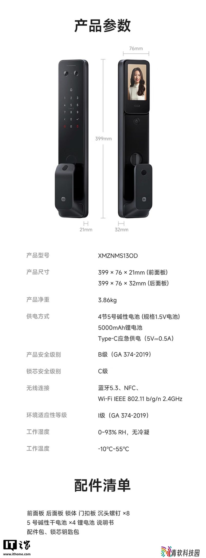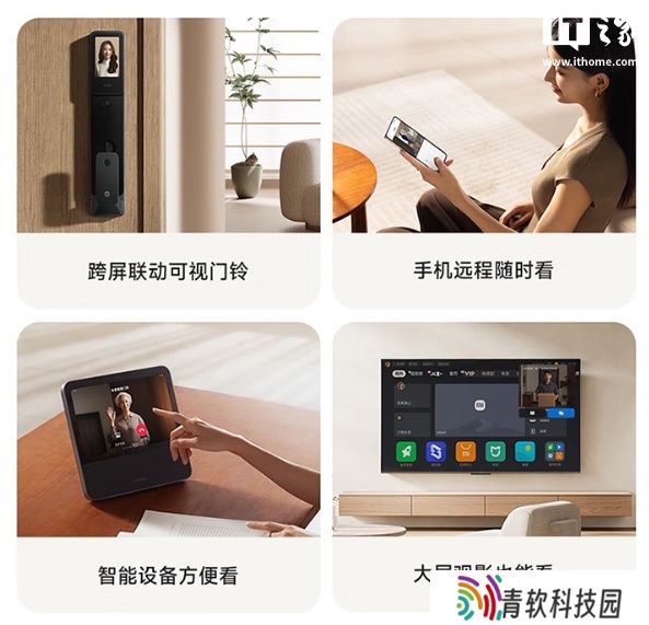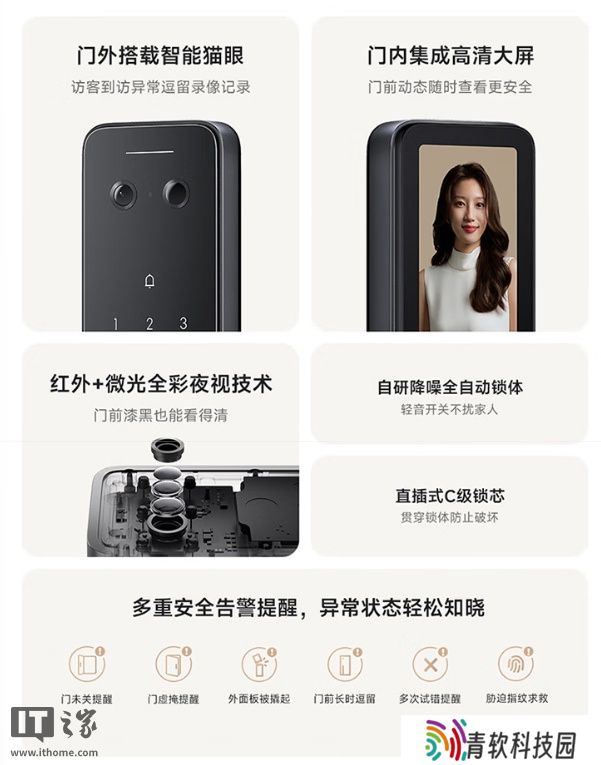 该产品还搭载新一代智能猫眼,无论身在何处都可随时随地查看门前动态,内置 AI 人形检测算法,有人靠近逗留时自动录像通知。内门锁嵌入可视大屏,访客按铃后门内屏幕可自动亮起,还可随时唤醒屏幕,查看门前异常情况。